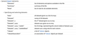 "Elements" list of elements and options available in this file "Summary" summary of the file "Rules" list of rules for all available elements - Specifying and selecting datasets: