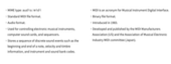 - Stores a sequence of discrete sound events such as the beginning and end of a note, velocity and timbre information, and instrument and sound bank codes.