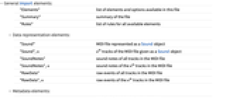 - Import["file.mid",{{elem1,elem2,…}}] imports multiple elements.