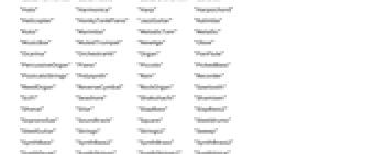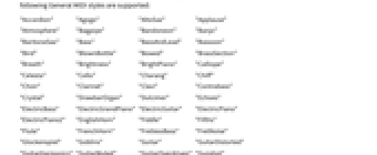 "Accordion" "Agogo" "AltoSax" "Applause" "Atmosphere" "Bagpipe" "Bandoneon" "Banjo" "BaritoneSax" "Bass" "BassAndLead" "Bassoon" "Bird" "BlownBottle" "Bowed" "BrassSection" "Breath" "Brightness" "BrightPiano" "Calliope" "Celesta" "Cello" "Charang" "Chiff" "Choir" "Clarinet" "Clavi" "Contrabass" "Crystal" "DrawbarOrgan" "Dulcimer" "Echoes" "ElectricBass" "ElectricGrandPiano" "ElectricGuitar" "ElectricPiano" "ElectricPiano2" "EnglishHorn" "Fiddle" "Fifths" "Flute" "FrenchHorn" "FretlessBass" "FretNoise" "Glockenspiel" "Goblins" "Guitar" "GuitarDistorted" "GuitarHarmonics" "GuitarMuted" "GuitarOverdriven" "Gunshot" "Halo" "Harmonica" "Harp" "Harpsichord" "Helicopter" "HonkyTonkPiano" "JazzGuitar" "Kalimba" "Koto" "Marimba" "MelodicTom" "Metallic" "MusicBox" "MutedTrumpet" "NewAge" "Oboe" "Ocarina" "OrchestraHit" "Organ" "PanFlute" "PercussiveOrgan" "Piano" "Piccolo" "PickedBass" "PizzicatoStrings" "Polysynth" "Rain" "Recorder" "ReedOrgan" "ReverseCymbal" "RockOrgan" "Sawtooth" "SciFi" "Seashore" "Shakuhachi" "Shamisen" "Shanai" "Sitar" "SlapBass" "SlapBass2" "SopranoSax" "Soundtrack" "Square" "Steeldrums" "SteelGuitar" "Strings" "Strings2" "Sweep" "SynthBass" "SynthBass2" "SynthBrass" "SynthBrass2" "SynthDrum" "SynthStrings" "SynthStrings2" "SynthVoice" "Taiko" "Telephone" "TenorSax" "Timpani" "Tinklebell" "TremoloStrings" "Trombone" "Trumpet" "Tuba" "TubularBells" "Vibraphone" "Viola" "Violin" "Voice" "VoiceAahs" "VoiceOohs" "Warm" "Whistle" "Woodblock" "Xylophone" - Percussion sounds are represented as an expression of the form SoundNote["perc",t]. Possible percussion styles include: