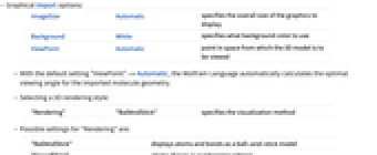 ImageSize Automatic specifies the overall size of the graphics to display Background White specifies what background color to use ViewPoint Automatic point in space from which the 3D model is to be viewed - With the default setting "ViewPoint"->Automatic, the Wolfram Language automatically calculates the optimal viewing angle for the imported molecule geometry.