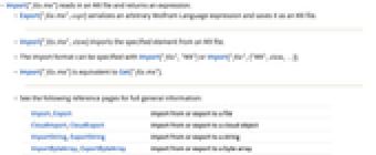 Import, Export import from or export to a file CloudImport, CloudExport import from or export to a cloud object ImportString, ExportString import from or export to a string ImportByteArray, ExportByteArray import from or export to a byte array