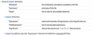 "Elements" list of elements and options available in this file "Summary" summary of the file "Rules" list of rules for all available elements - Import elements: