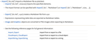 Import, Export import from or export to a file CloudImport, CloudExport import from or export to a cloud object ImportString, ExportString import from or export to a string ImportByteArray, ExportByteArray import from or export to a byte array