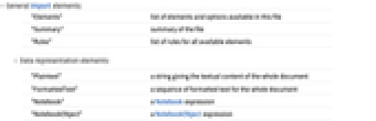 "Elements" list of elements and options available in this file "Summary" summary of the file "Rules" list of rules for all available elements - Data representation elements: