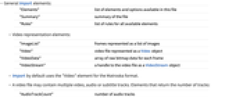 "ImageList" frames represented as a list of images "Video" video file represented as a Video object "VideoData" array of raw bitmap data for each frame "VideoStream" a handle to the video file as a VideoStream object - Import by default uses the "Video" element for the Matroska format.