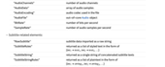 "Audio" in-core Audio object "AudioChannels" number of audio channels "AudioData" array of audio samples "AudioEncoding" audio codec used in the file "AudioFile" out-of-core Audio object "BitRate" number of bits per second "SampleRate" number of audio samples per second - Subtitle-related elements: