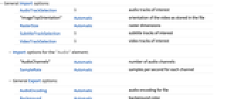 AudioTrackSelection 1 audio tracks of interest "ImageTopOrientation" Automatic orientation of the video as stored in the file RasterSize Automatic raster dimensions SubtitleTrackSelection 1 subtitle tracks of interest VideoTrackSelection 1 video tracks of interest - Import options for the "Audio" element: