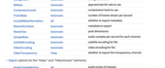 AudioEncoding Automatic audio encoding for file Background Automatic background color BitRate Automatic approximate bit rate to use CompressionLevel Automatic compression level to use FrameRate Automatic number of frames shown per second IncludeMetaInformation All whether to export metadata MetaInformation Automatic metadata to export RasterSize Automatic pixel dimensions SampleRate Automatic audio samples per second for each channel SubtitleEncoding Automatic subtitle encoding for file VideoEncoding Automatic video encoding for file VideoTransparency False whether to export the transparency channel - Export options for the "Video" and "VideoStream" elements: