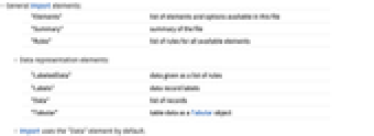 "Elements" list of elements and options available in this file "Summary" summary of the file "Rules" list of rules for all available elements - Data representation elements: