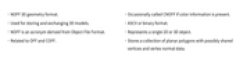 "Graphics" 2D NOFF file represented as a Graphics object "Graphics3D" 3D geometry represented as a Graphics3D object "GraphicsComplex" NOFF file as a GraphicsComplex object "PolygonColors" face color information, given as a list of color primitives associated with each polygon "PolygonData" the polygon elements in indexed form "PolygonObjects" list of Polygon primitives given in absolute coordinates "VertexColors" colors associated with each vertex, given as a list of color primitives "VertexData" list of vertex coordinates "VertexNormals" normal vectors corresponding to the vertices given by "VertexData" - Import and Export by default use the "Graphics3D" element to represent 3D geometries and the "Graphics" element for 2D objects.