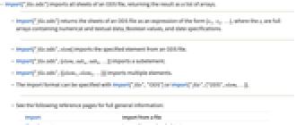 - Import["file.ods",{elem,suba,subb,…}] imports a subelement.
