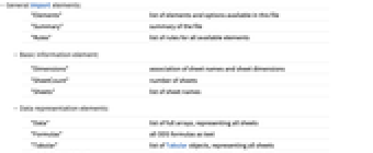 "Dimensions" association of sheet names and sheet dimensions "SheetCount" number of sheets "Sheets" list of sheet names - Data representation elements: