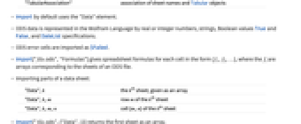 "Data" list of full arrays, representing all sheets "Formulas" all ODS formulas as text "Tabular" list of Tabular objects, representing all sheets "TabularAssociation" association of sheet names and Tabular objects - Import by default uses the "Data" element.
