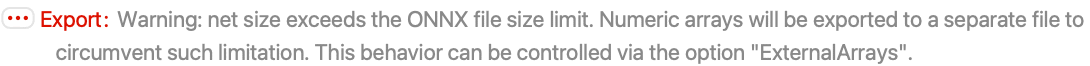 "Description" None model documentation string in ONNX metadata "ExternalArrays" Automatic export net arrays to separate files "GraphName" Automatic graph name in ONNX metadata "ModelVersion" 0 model version in ONNX metadata "OperatorSetVersion" Automatic version of the standard ONNX operator set used by the model - Option "ExternalArrays" can be set to the following: