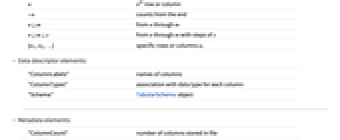 n nth row or column -n counts from the end n;;m from n through m n;;m;;s from n through m with steps of s {n1,n2,…} specific rows or columns ni - Data descriptor elements: