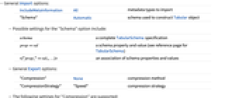 schema a complete TabularSchema specification propval a schema property and value (see reference page for TabularSchema) <|"prop1"val1,…|> an association of schema properties and values - General Export options:
