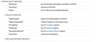 "ObjectTypes" types of encoded objects in the file "ObjectTypeLabels" names of objects in the header lines "PrivateKey" list of PrivateKey objects "PublicKey" list of PublicKey objects "SecurityCertificate" list of SecurityCertificate objects "Summary" summary of properties - Data representation elements: