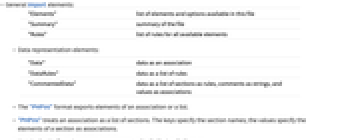 "Elements" list of elements and options available in this file "Summary" summary of the file "Rules" list of rules for all available elements - Data representation elements: