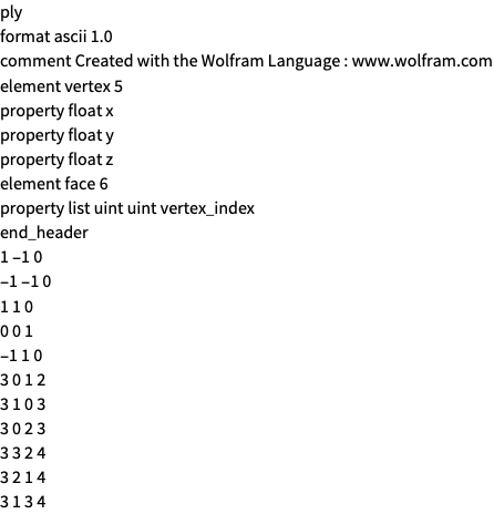 "Graphics3D" PLY file represented as a Graphics3D object "GraphicsComplex" PLY file as a GraphicsComplex object "PolygonObjects" list of polygon primitives given in absolute coordinates - Import and Export use the "MeshRegion" element by default for PLY files.