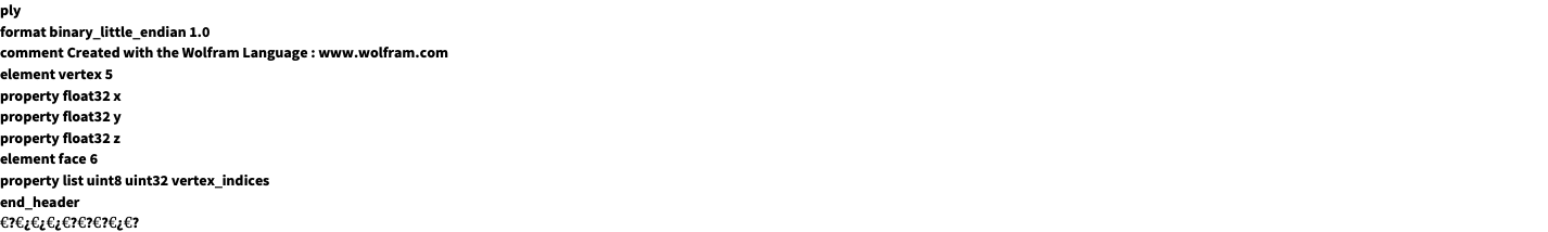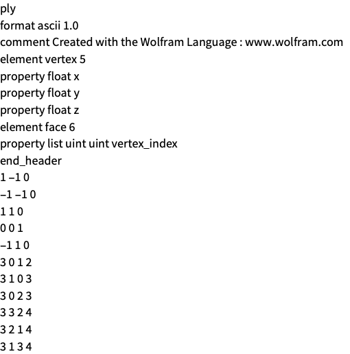 - The export format can be specified with Export["file",expr,"PLY"] or Export["file",{"PLY",opt1->val1,…}].