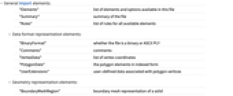 "BinaryFormat" whether the file is a binary or ASCII PLY "Comments" comments "VertexData" list of vertex coordinates "PolygonData" the polygon elements in indexed form "UserExtensions" user-defined data associated with polygon vertices - Geometry representation elements: