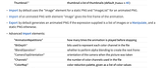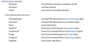 "AnimatedImage" animated PNG represented as an AnimatedImage object "Animation" animated PNG represented as an animation object "Data" array of pixel values "Graphics" first frame of a PNG file, given as a Graphics object "GraphicsList" frames of an animated PNG as a list of Graphics objects "Image" first frame of a PNG file, given as an Image object "ImageList" frames of an animated PNG as a list of Image objects "RawData" array of color map indices Thumbnail" thumbnail a list of thumbnails (default frames=All) - Import by default uses the "Image" element for a static PNG and "ImageList" for an animated PNG.