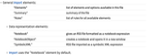 "Elements" list of elements and options available in this file "Summary" summary of the file "Rules" list of rules for all available elements - Data representation elements: