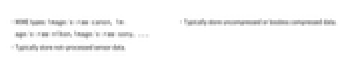 - Typically store uncompressed or lossless compressed data.