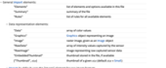 "Data" array of color values "Graphics" Graphics object representing an image "Image" raster image, given as an Image object "RawData" array of intensity values captured by the sensor "RawImage" image representing raw captured sensor data "EmbeddedThumbnail" thumbnail stored in the file, if available {"Thumbnail",size} thumbnail of a given size (default size = Small) - Import by default uses the "Image" element for raw image formats.