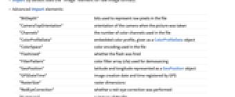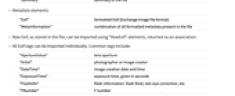 "Exif" formatted Exif (Exchange image file format) "MetaInformation" combination of all formatted metadata present in the file - Raw Exif, as stored in the file, can be imported using "RawExif" elements, returned as an association.