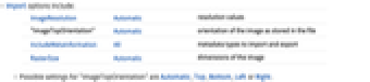 ImageResolution Automatic resolution values "ImageTopOrientation" Automatic orientation of the image as stored in the file IncludeMetaInformation All metadata types to import and export RasterSize Automatic dimensions of the image - Possible settings for "ImageTopOrientation" are Automatic, Top, Bottom, Left or Right.