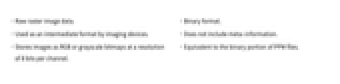 - Stores images as RGB or grayscale bitmaps at a resolution of 8 bits per channel.