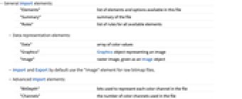"Data" array of color values "Graphics" Graphics object representing an image "Image" raster image, given as an Image object - Import and Export by default use the "Image" element for raw bitmap files.