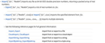 Import, Export import from or export to a file CloudImport, CloudExport import from or export to a cloud object ImportString, ExportString import from or export to a string ImportByteArray, ExportByteArray import from or export to a byte array