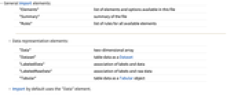 "Elements" list of elements and options available in this file "Summary" summary of the file "Rules" list of rules for all available elements - Data representation elements: