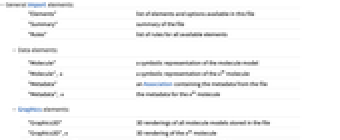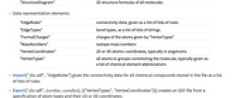 "EdgeRules" connectivity data, given as a list of lists of rules "EdgeTypes" bond types, as a list of lists of strings "FormalCharges" charges of the atoms given by "VertexTypes" "MassNumbers" isotope mass numbers "VertexCoordinates" 2D or 3D atomic coordinates, typically in angstroms "VertexTypes" all atoms or groups constituting the molecule, typically given as a list of chemical element abbreviations - Import["file.sdf","EdgeRules"] gives the connectivity data for all chemical compounds stored in the file as a list of lists of rules.