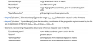"DataFormat" type used to represent elevation values "ElevationRange" range of elevation values in meters "RasterSize" size of the terrain grid "SpatialRange" range of geographic coordinates, given in coordinate system units "SpatialResolution" grid spacing in coordinate system units - Import["file.dem","ElevationRange"] gives the range {zmin, zmax} of elevation values in units of meters.