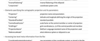 "Projection" projection name and parameters "Centering" latitude and longitude defining the origin of the projection "StandardParallels" standard parallels "CentralScaleFactor" scale factor at the central meridian or center of projection "GridOrigin" grid coordinates {n,e} of the central parallel and meridian "ProjectionName" Wolfram Language standard name of the projection used "ReferenceModel" what reference sphere or ellipsoid to use - Accessing low-level meta-information from the file: