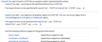 - Import["file.step"] imports a STEP file as a graphics object representing the surface.