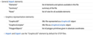 "Elements" list of elements and options available in this file "Summary" summary of the file "Rules" list of rules for all available elements - Graphics representation elements: