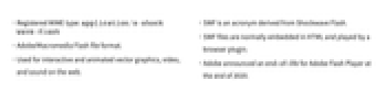 - Used for interactive and animated vector graphics, video, and sound on the web.