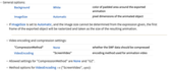 Background White color of padded area around the exported animation ImageSize Automatic pixel dimensions of the animated object - If ImageSize is set to Automatic, and the image size cannot be determined from the expression given, the first frame of the exported object will be rasterized and taken as the size of the resulting animation.