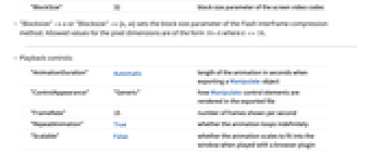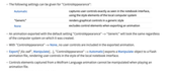 "AnimationDuration" Automatic length of the animation in seconds when exporting a Manipulate object "ControlAppearance" "Generic" how Manipulate control elements are rendered in the exported file "FrameRate" 15 number of frames shown per second "RepeatAnimation" True whether the animation loops indefinitely "Scalable" False whether the animation scales to fit into the window when played with a browser plugin - The following settings can be given for "ControlAppearance":