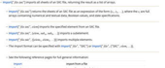 - Import["file.sxc",{{elem1,elem2,…}}] imports multiple elements.