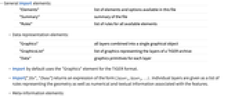 "Graphics" all layers combined into a single graphical object "GraphicsList" list of graphics representing the layers of a TIGER archive "Data" graphics primitives for each layer - Import by default uses the "Graphics" element for the TIGER format.