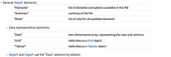 "Elements" list of elements and options available in this file "Summary" summary of the file "Rules" list of rules for all available elements - Data representation elements: