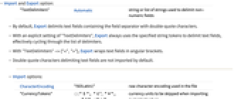 - With "TextDelimiters"->{"<",">"}, Export wraps text fields in angular brackets.