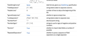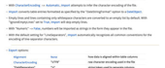 ", "p", "F"}}currency units to be skipped when importing numerical values "DateStringFormat" None date format, given as a DateString specification "FieldSeparators" {" ","∖t"} string tokens taken to separate columns "HeaderLines" 0 number of lines to skip at the beginning of the file "IgnoreEmptyLines" False whether to ignore empty lines "LineSeparators" {"∖r\n","∖n","\r"} string tokens taken to separate rows "NumberPoint" "." decimal point string "NumberSigns" {"-","+"} strings to use for signs of negative and positive numbers "Numeric" True whether to import data fields as numbers if possible "RepeatedSeparators" True whether to parse a sequence of field separators as a single separator - With CharacterEncoding -> Automatic, Import attempts to infer the character encoding of the file.