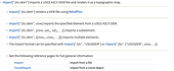 - Import["file.dem"] imports a USGS ASCII DEM file and renders it as a topographic map.